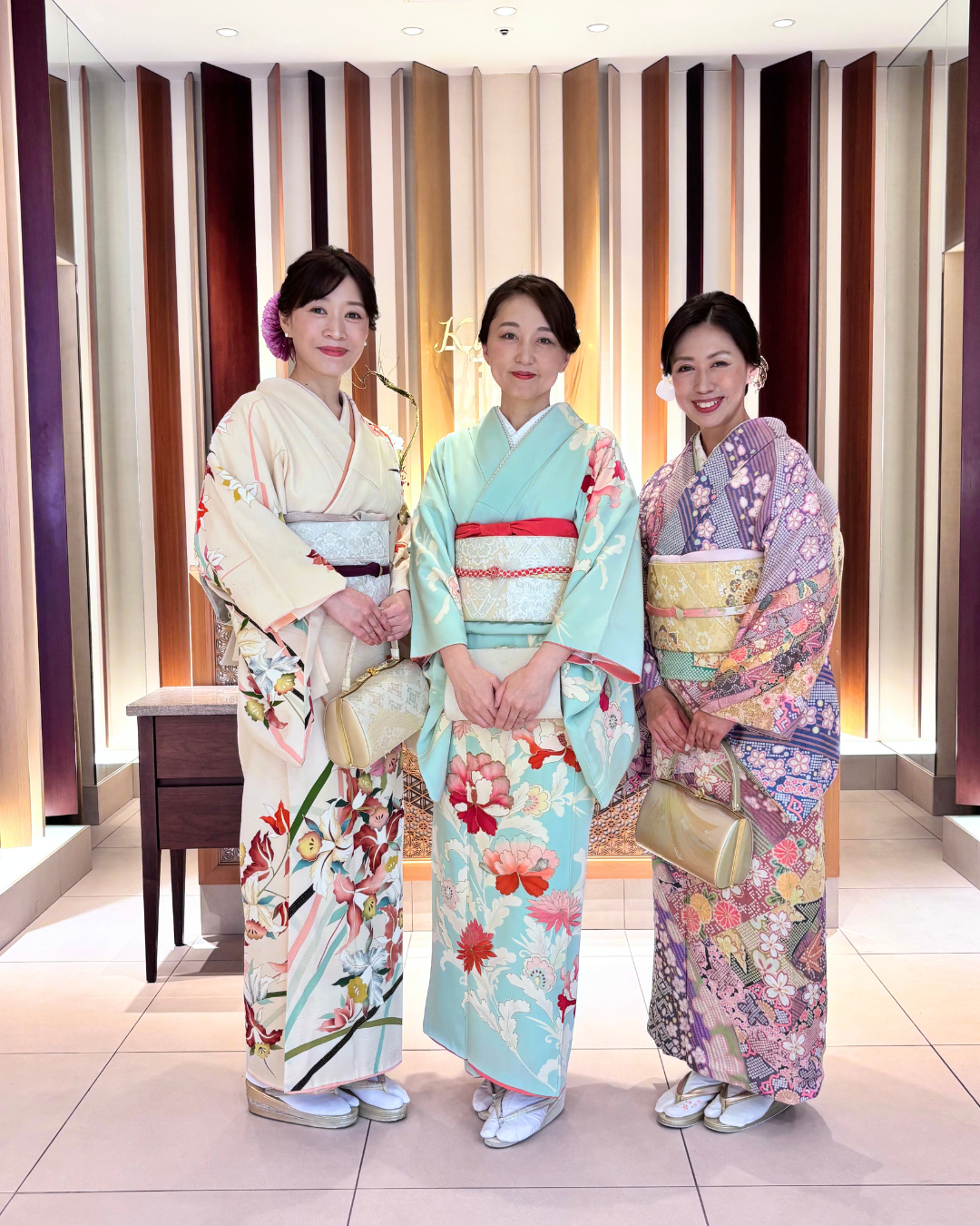 今回は、友人たちと一緒に3人でお着物を着て参列しました。 3人並ぶと、より会場がパッと華やぐようで、お着物ならではの良さを再確認。 大切な友人の門出に、みんなでおめかしして駆けつけられたことも、素敵な思い出の一つです。
