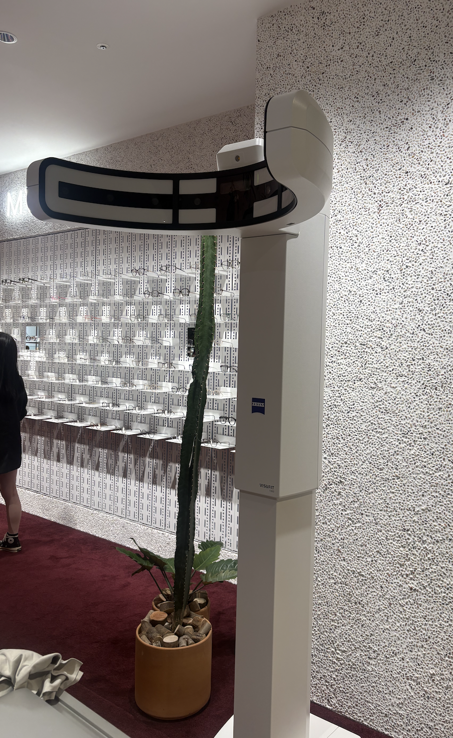今回特に驚いたのが、店内に設置された「3D顔撮影・測定機器」。 お客様の顔をぐるりと囲むような「アーチ状のカメラ」で撮影し、その場で高精度な3Dデータを作成するものです。